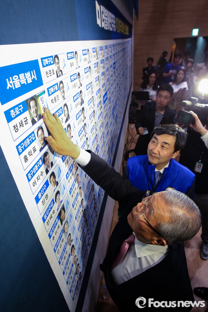 (서울=포커스뉴스) 20대 총선 투표일인 13일 오후 서울 여의도 국회 의원회관 대회의실에 마련된 더불어민주당 개표상황실에서 김종인 비대위 대표 겸 선대위원장, 이종걸 원내대표이 당선이 확정된 정세균 종로구 후보의 사진 옆에 당선 스티커를 부착하고 있다.