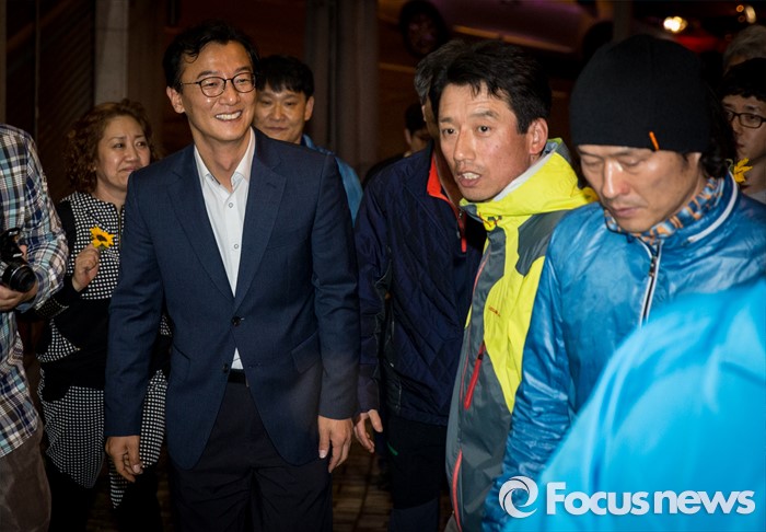 (부산=포커스뉴스) 전재수 더불어민주당 부산 북구강서구갑 후보가 13일 오후 부산 북구 선거사무소에서 당선이 확실시되자 지지자들과 함께 미소짓고 있다.