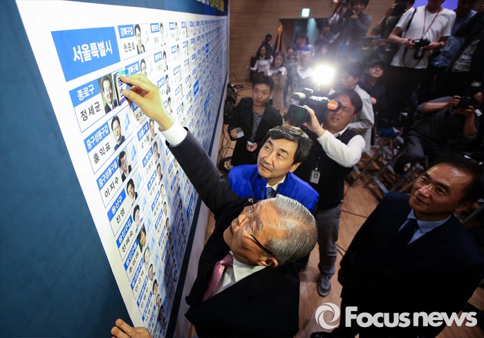 (서울=포커스뉴스) 20대 총선 투표일인 13일 오후 서울 여의도 국회 의원회관 대회의실에 마련된 더불어민주당 개표상황실에서 김종인 비대위 대표 겸 선대위원장, 이종걸 원내대표, 정장선 총선기획단장이 당선이 확정된 정세균 종로구 후보의 사진 옆에 당선 스티커를 부착하고 있다.