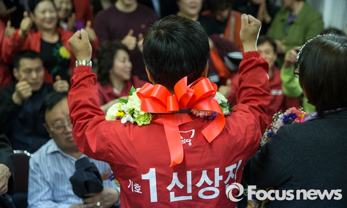 (성남=포커스뉴스) 제20대 국회의원 선거날인 13일 오후 경기도 성남 중원구에 위치한 선거사무실에서 신상진 새누리당 후보가 '당선확실' 이라는 방송사 개표 상황을 확인하고 지지자들의 축하를 받고 있다.