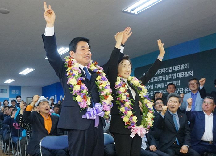 (서울=포커스뉴스) 20대 총선에서 당선이 확실시된 김진표 더불어민주당 경기 수원무 후보가 13일 경기도 수원 자신의 선거캠프에서 지지자들과 함께 기뻐하고 있다. <사진제공=김진표 후보 선거사무소>