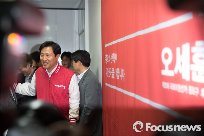 (서울=포커스뉴스) 제20대 국회의원선거일인 13일 오후 종로구에서 정세균 더불어민주당 후보에게 패배한 오세훈 후보가 지지자들과 인사를 하며 선거사무소를 빠져나가고 있다.