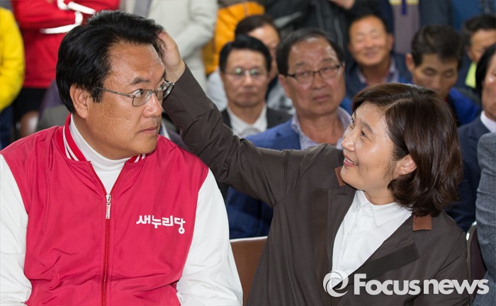 (공주=포커스뉴스) 13일 오후 충남 공주 선거사무소에서 제20대 충남 공주부여청양 국회의원에 당선된 정진석 새누리당 당선인의 머리를 부인 이미호 여사가 만져주고 있다.