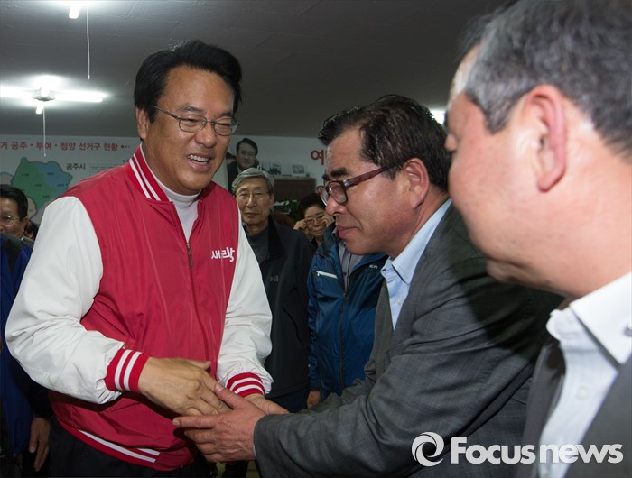 (공주=포커스뉴스) 제20대 충남 공주부여청양 국회의원에 당선된 정진석 새누리당 당선인이 13일 오후 충남 공주 선거사무소에서 지지자들과 악수를 하고 있다.