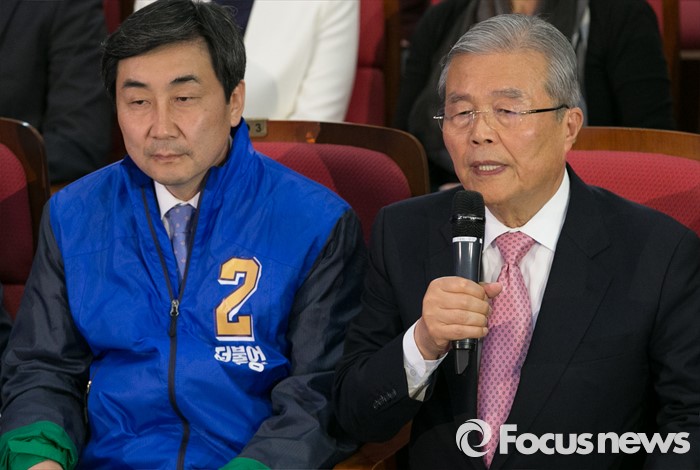 (서울=포커스뉴스) 20대 총선 투표일인 13일 오후 서울 여의도 국회 의원회관 대회의실에 마련된 더불어민주당 개표상황실에서 김종인 비대위 대표 겸 선대위원장이 개표방송 시청 소감을 전하고 있다. 왼쪽은 이종걸 원내대표.