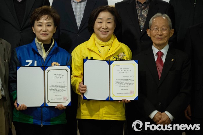 (서울=포커스뉴스) 13일 치러진 제20대 국회의원 총선거에서 경기 고양정 지역구에 출마한 더불어민주당 김현미후보가 오후 11시 50분 현재 49.1%의 득표율(6만1360표)로 당선이 확정됐다. 2위는 37%를 차지한 새누리당 김영선 후보가 차지했다.(고양=포커스뉴스) 20대 총선을 일주일 앞둔 6일 오전 고양시 일산동구의 한 교회에서 열린 '100만고양자치연대' 좋은후보 추천식에 참석한 심상정(가운데) 정의당 고양시갑 후보와 김현미(왼쪽) 더불어민주당 고양시정 후보가 추천서를 들고 기념촬영 하고 있다. 2016.04.06 이승배 기자