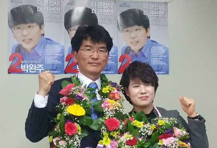 (서울=포커스뉴스) 20대 총선 당선이 확정된 박완주 더불어민주당 충남 천안을 후보 부부가 13일 오후 충남 천안 자신의 선거캠프에서 포즈를 취하고 있다. <사진제공=박완주 후보 선거사무소>