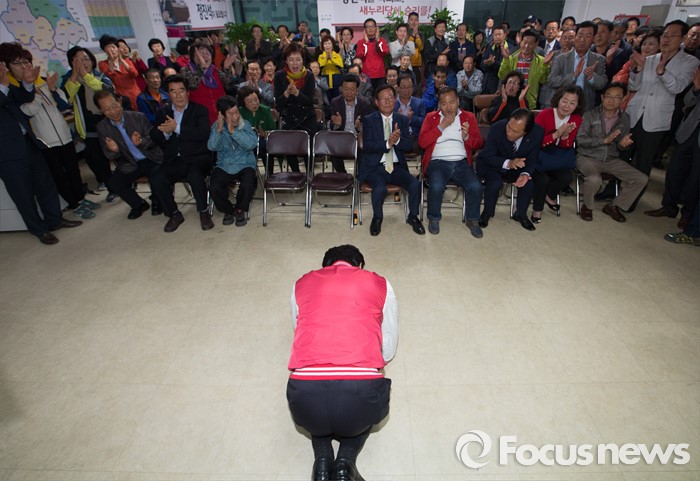 (공주=포커스뉴스) 제20대 충남 공주부여청양 국회의원에 당선된 정진석 새누리당 당선인이 13일 오후 충남 공주 선거사무소에서 지지자들에게 큰절을 올리고 있다.
