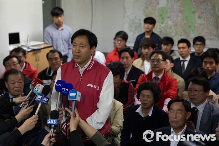 (서울=포커스뉴스) 제20대 국회의원선거일인 13일 오후 종로구에서 정세균 더불어민주당 후보가 당선이 확실시 된 가운데 오세훈 새누리당 후보가 서울 종로구 자신의 선거사무소에서 입장을 밝히고 있다.