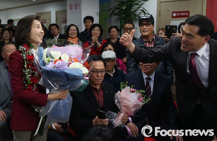(서울=포커스뉴스) 제20대 국회의원 선거날인 13일 오후 서울 동작구에 위치한 선거사무실에서 나경원 새누리당 동작구을 후보가 지지자들에게 축하를 받고 있다.