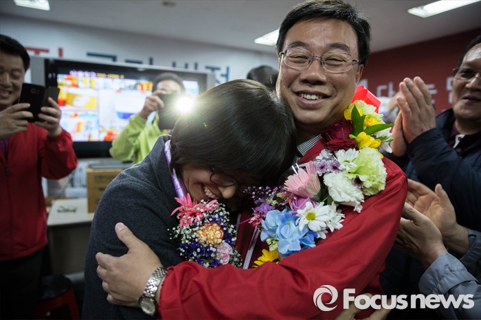 2위는 38.9%를 차지한 더불어민주당 은수미 후보가 차지했다.(성남=포커스뉴스) 제20대 국회의원 선거날인 13일 오후 경기도 성남 중원구에 위치한 선거사무실에서 신상진 새누리당 후보가 '당선확실' 이라는 방송사 개표 상황을 확인하고 부인 김미숙씨와 포옹하고 있다. 2016.04.13 성동훈 기자