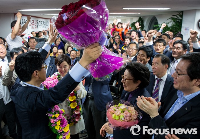 (부산=포커스뉴스) 제20대 국회의원선거에서 당선이 확실시된 장제원 무소속 부산 사상구 후보가 14일 오전 부산 사상구 선거사무소에서 지지자들과 기쁨을 나누고 있다.