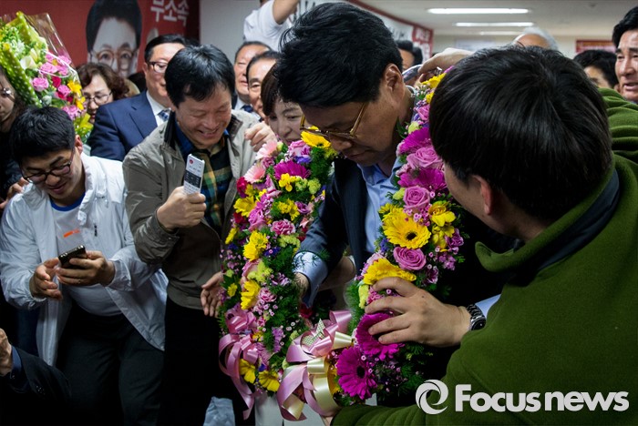(부산=포커스뉴스) 제20대 국회의원선거에서 당선이 확실시된 장제원 무소속 부산 사상구 후보가 14일 오전 부산 사상구 선거사무소에서 지지자들에게 꽃목걸이를 받고 있다.