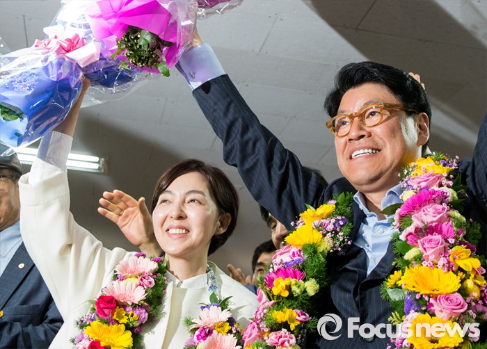 (부산=포커스뉴스) 제20대 국회의원선거에서 당선이 확실시된 장제원 무소속 부산 사상구 후보가 14일 오전 부산 사상구 선거사무소에서 부인과 함께 밝게 웃고 있다.