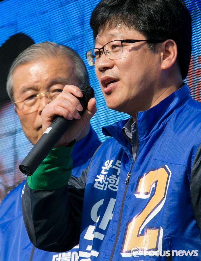 2위는 45.1%를 차지한 국민의당 임정엽 후보가 차지했다.(완주=포커스뉴스) 1일 오후 전북 완주군 둔산공원 앞 사거리에서 안호영(오른쪽) 더불어민주당 완주·진안·무주·장수군 후보가 지지를 호소하고 있다. 2016.04.01 박동욱 기자