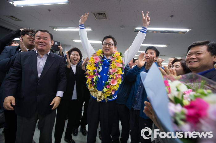(서울=포커스뉴스) 강병원 더불어민주당 은평을 후보가 14일 오전 서울 은평구 선거사무소에서 당선이 유력시되자 지지자들과 함께 기쁨을 나누고 있다.