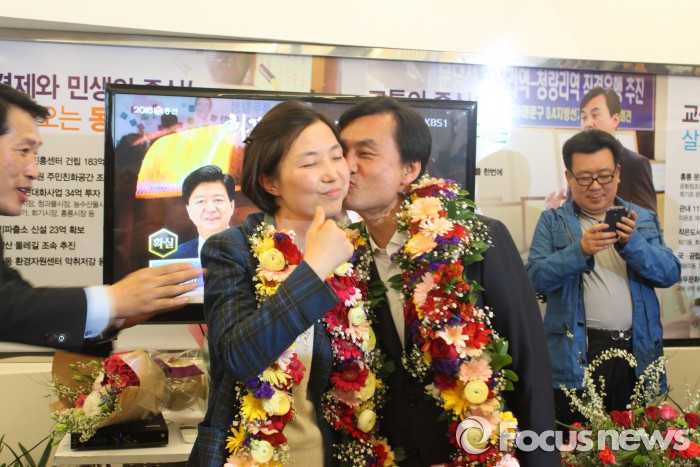 서울 동대문구에 사는 지지자 양모(57)씨는 "출구조사 결과는 좋았는데 왜 이렇게 됐는지 모르겠다"며 "허 후보의 역전을 기대했지만 결국 고배를 마셨다"고 허 후보 낙선에 대한 안타까운 마음을 전했다.13일 서울 동대문구갑 선거구 안규백 더불어민주당 후보가 당선이 확실시되자 부인의 볼에 입을 맞추고 있다. 김대석 기자 13일 서울 동대문구갑 선거구 새누리당 허용범 후보가 낙선이 확실시되자 지지자들이 망연자실해 하고 있다. 김대석 기자