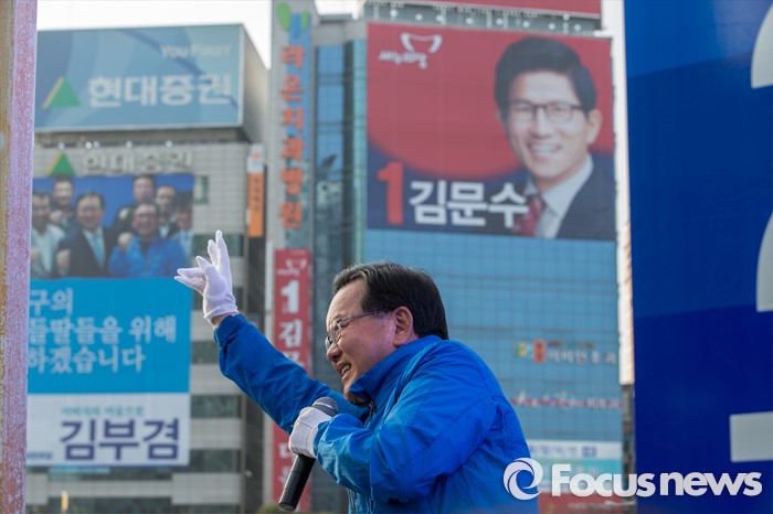 (대구=포커스뉴스) 제20대 국회의원선거 대구 수성구갑 선거구에서 당선된 더불어민주당 김부겸 당선자가 14일 오전 대구 수성구 범어네거리에서 당선 인사를 하고 있다.