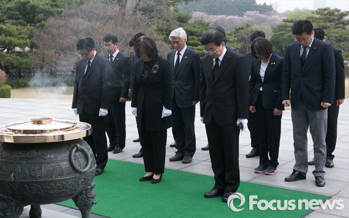 (서울=포커스뉴스) 심상정 정의당 상임대표와 20대 총선 비례대표 당선인들이 14일 오전 동작구 국립서울현충원에서 현충탑 참배를 하고 있다.