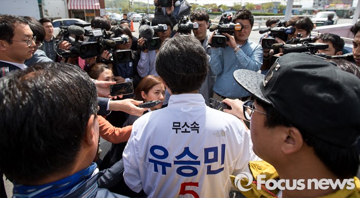 (대구=포커스뉴스) 제20대 국회의원선거 대구 동구을 지역구에서 당선된 무소속 유승민 당선자가 14일 오전 대구 동구 불로시장에 도착해 당선인사에 앞서 취재진과 인터뷰 하고 있다.