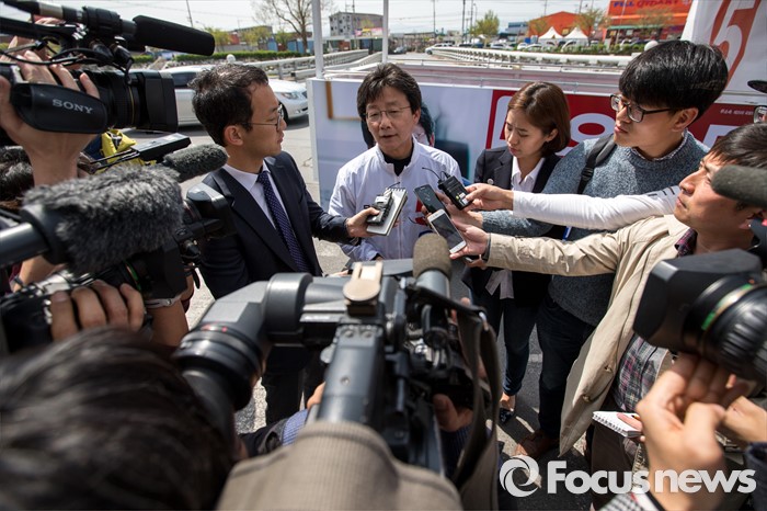 (대구=포커스뉴스) 제20대 국회의원선거 대구 동구을 지역구에서 당선된 무소속 유승민 당선자가 14일 오전 대구 동구 불로시장에 도착해 당선인사에 앞서 취재진과 인터뷰 하고 있다.