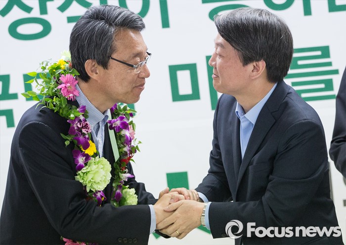 (서울=포커스뉴스) 안철수 국민의당 상임공동대표가14일 오전 마포구 당사에서 김성식 관악구갑 국회의원 당선자를 축하해주고 있다.