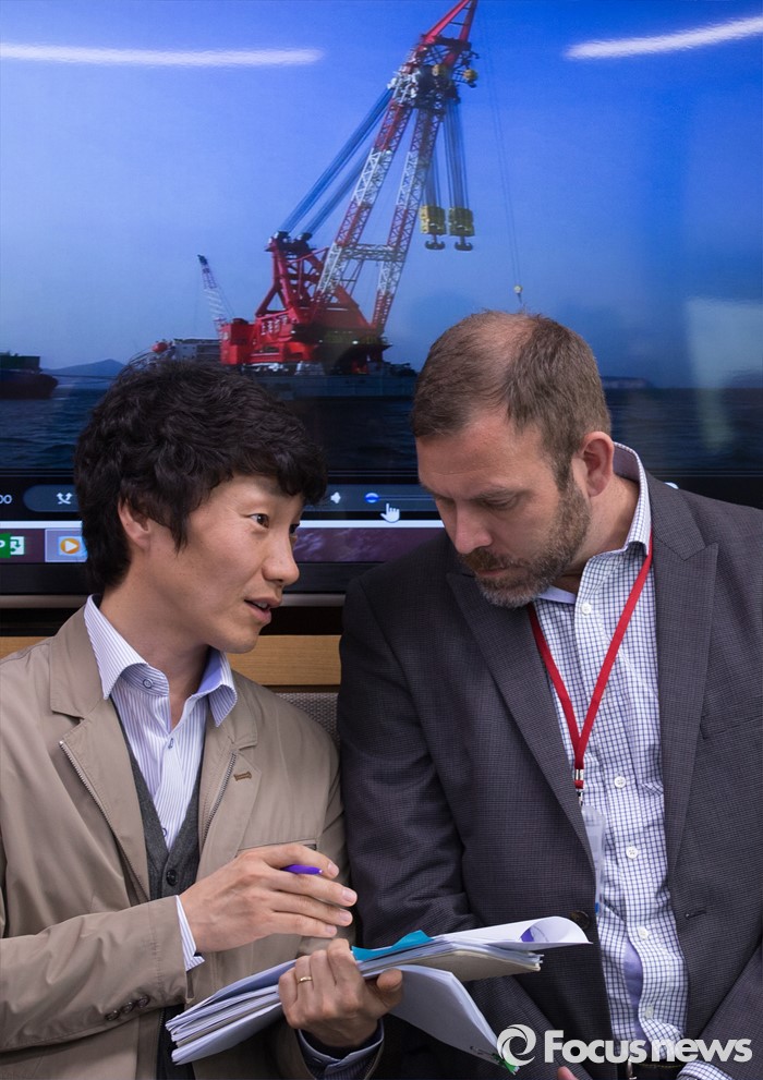 (세종=포커스뉴스) 14일 오전 세종시 정부세종청사 해양수산부 기자실에서 Simon Burthem TMC 지사장이 직원과 대화를 나누고 있다.