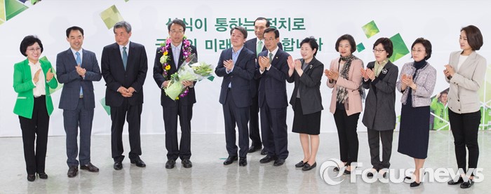 (서울=포커스뉴스) 안철수 국민의당 상임공동대표(왼쪽 다섯번째)및 지도부가 14일 오전 마포구 당사에서 김성식 관악구갑 국회의원 당선자(왼쪽 네번째)를 축하하고 있다.