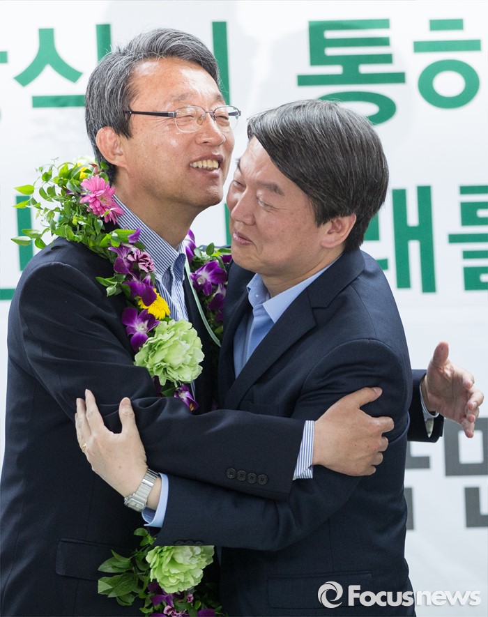 (서울=포커스뉴스) 안철수 국민의당 상임공동대표가14일 오전 마포구 당사에서 김성식 관악구갑 국회의원 당선자에게 꽃목걸이를 걸고 안아주고 있다.