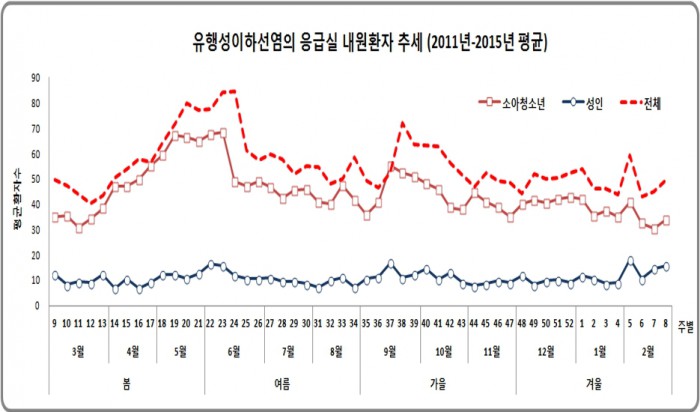 한편, 보건복지부와 중앙응급의료센터는 응급의료 데이터에 대한 분석을 강화해 계절별, 상황별로 국민들이 주의해야할 사항을 월 1회 이상 발표할 계획이다.유행성이하선염의 응급실 내원환자 추세(2011년~2015년 평균, 주 단위) <자료출처=보건복지부>