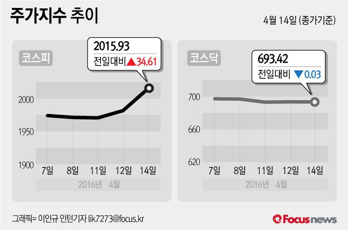 (서울=포커스뉴스) 14일 코스피지수는 전날 보다 1.75%(34.61포인트) 오른2015.93에 장을 마쳤다. 코스닥지수는 전일 대비 0.03포인트 내린 693.42에 마감했다.