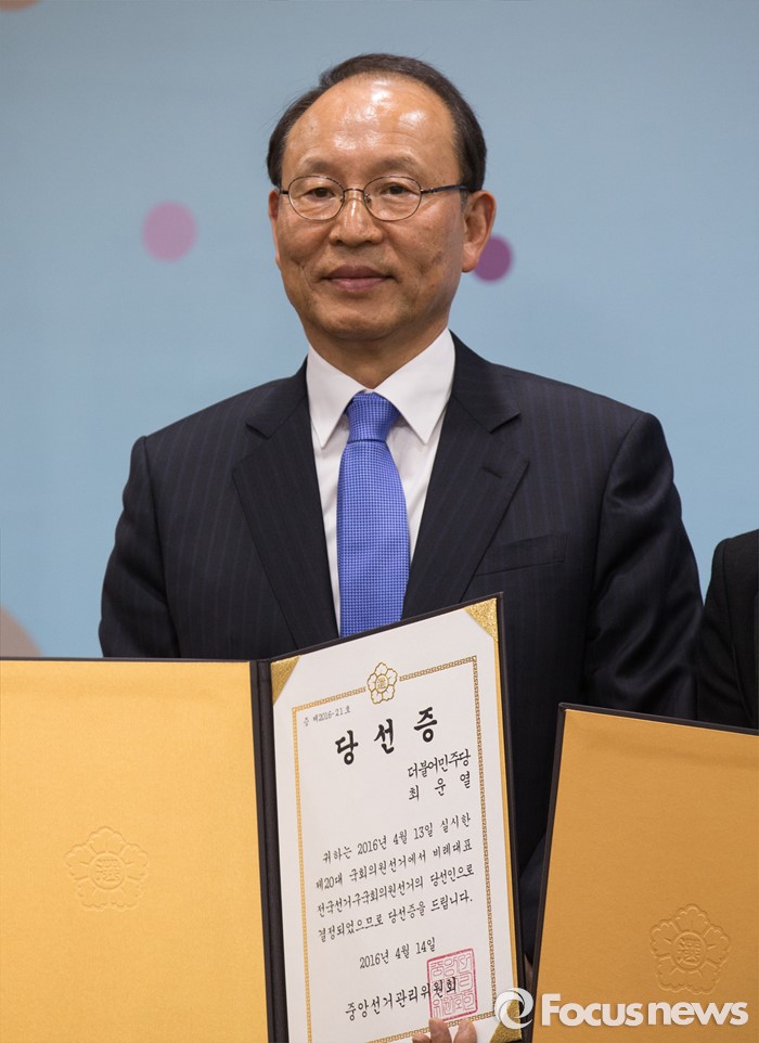 (과천=포커스뉴스) 14일 오후 경기도 과천 중앙선거관리위원회 회의실에서 열린 제20대 국회의원선거 비례대표국회의원 당선증 교부식에 참석한 최운열 더불어민주당 당선인이 기념촬영 하고 있다.