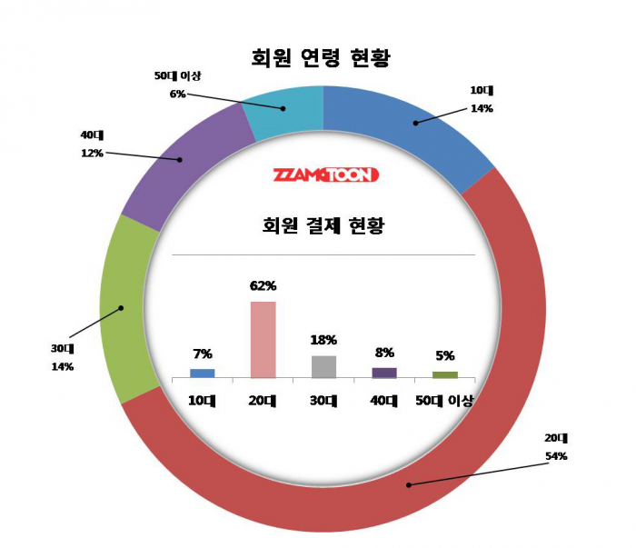 투믹스의 웹툰 플랫폼 짬툰이 지난해 6월부터 12월까지 자사 서비스를 이용한 회원들을 연령대별로 조사한 결과 전체 회원 중 54%가 20대인 것으로 나타났다. 10대와 30대가 각각 14%로 뒤를 이었고 40대 이상은 12%, 50대 이상은 6%로 집계됐다.
