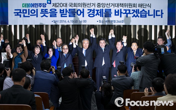 (서울=포커스뉴스) 김종인 더불어민주당 비대위 대표 겸 선대위원장과 선대위원들이 15일 오후 서울 여의도 국회에서 열린 20대 총선 중앙선대위 해단식에 참석해 손을 들어 포즈를 취하고 있다.