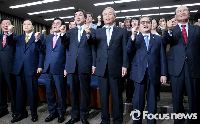 (서울=포커스뉴스) 김종인 더불어민주당 비대위 대표 겸 선대위원장과 선대위원들이 15일 오후 서울 여의도 국회에서 열린 20대 총선 중앙선대위 해단식에 참석해 구호를 외치고 있다.