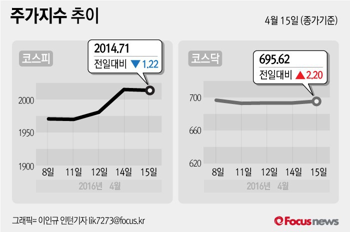 (서울=포커스뉴스) 15일 코스피지수는 전날 보다 0.06%(1.22포인트) 내린 2014.71에 장을 마쳤다. 코스닥지수는 전일 대비 0.32%(2.20포인트) 오른 695.62에 마감했다.