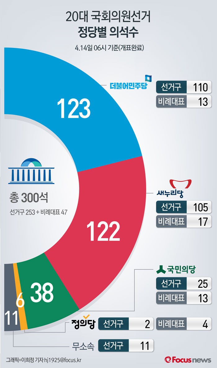 이번 총선에서 더불어민주당 123석, 새누리당 122석을 의석을 확보했지만 양당 모두 과반수에 미달해, 여당인 새누리당이 원내 2당으로 밀려났다.