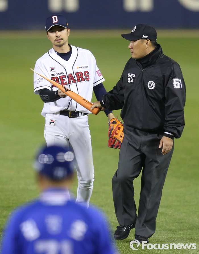 (서울=포커스뉴스) 15일 서울 잠실구장에서 열린 2016 프로야구 삼성-두산 경기 7회초 두산 2루수 오재원이 삼성 최형우의 부러진 배트를 주워 문동균 1루심에게 넘겨 주고 있다.