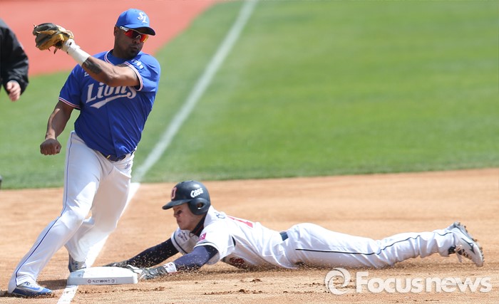 (서울=포커스뉴스) 17일 서울 잠실구장에서 열린 2016 프로야구 삼성-두산 경기 1회말 선두타자로 나와 유격수 실책으로 진루한 두산 2루주자 허경민이 1사후 민병헌 타석때 3루 도루를 시도해 세이프되고 있다.