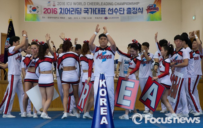 (서울=포커스뉴스) 17일 오후 서울 서대문구 동명여자중학교 체육관에서 열린 '2016 치어리딩 국가대표 선수단 출정식'에 참석한 선수들이 치어리딩 연기 전 파이팅을 외치고 있다.