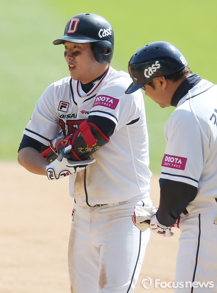 (서울=포커스뉴스) 17일 서울 잠실구장에서 열린 2016 프로야구 삼성-두산 경기 4회말 2사 2,3루에서 두산 허경민이 중견수 왼쪽에 떨어지는 2타점 안타를 치고 1루에서 프로텍터를 벗고 있다.