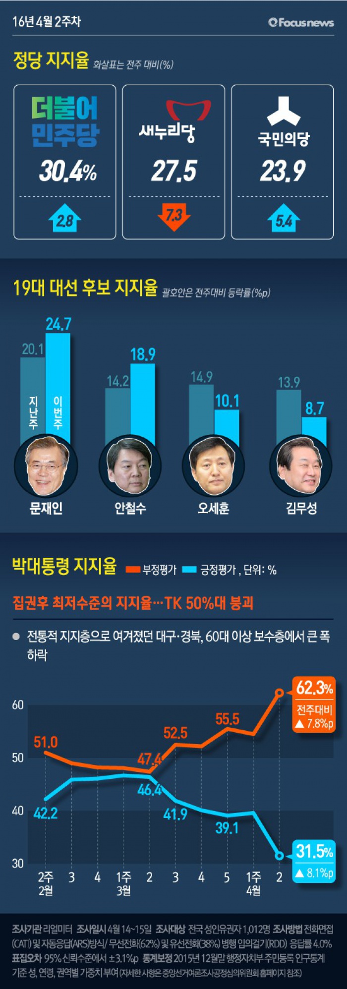 박근혜 대통령 지지율은 여당의 총선 참패로 거의 대부분의 지역, 연령층에서 지지층 이탈이 가속화되며 집권 후 최고 부정평가(62.3%)를 기록했다. 긍정평가는 31.5%로 부정평가와 긍정평가의 격차는 지난주 14.9%p에서 15.9%p 더 벌어진 30.8%p로 취임 후 가장 큰 폭으로 벌어졌다.