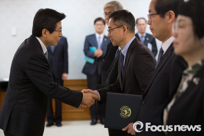 (서울=포커스뉴스) 황교안 국무총리가 18일 오전 서울 종로구 정부서울청사에서 민간위원에게 도시재생특별위 위촉장을 수여하고 있다.
