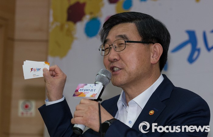 (대전=포커스뉴스) 이기권 고용노동부장관이 대전 유성구 충남대학교를 방문, 대학생들과 함께 찾아가는 정책설명회 및 토크콘서트에서 명함 뒷면에 '일취월장'문구를 보이고 있다.