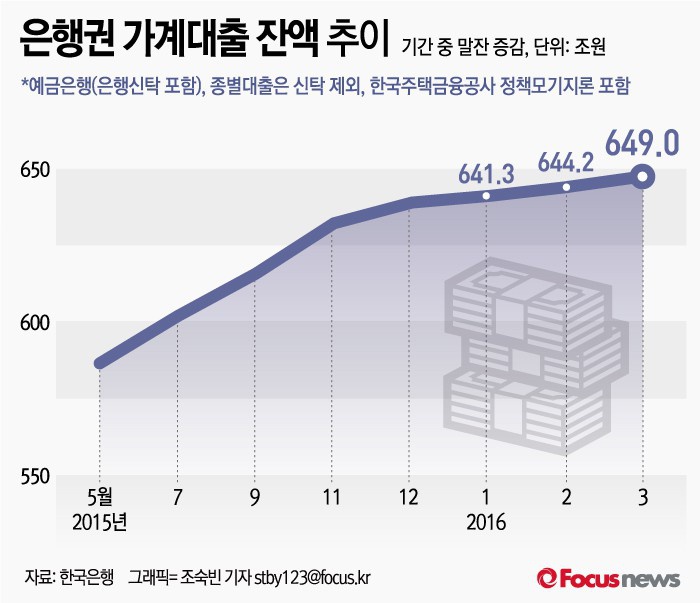 (서울=포커스뉴스) 18일 한국은행은 '2016년 3월 중 금융시장 동향'을 통해 올해 3월 은행권 가계대출 잔액이 649조원으로 전월 대비 4조9000억원 늘었다고 밝혔다.