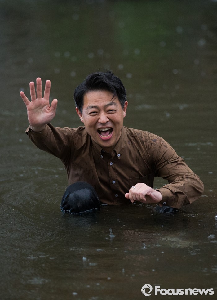 (서울=포커스뉴스) 제20대 국회의원 선거에서 당선된 김영호 더불어민주당 서대문을 당선자가 18일 오후 서울 서대문구 홍제천 폭포마당에 입수 하고 있다. 김 당선자는 서대문을 지역 투표율 60% 달성 시 홍제천 입수, 아내는 픽미댄스를 추겠다고 약속 하였다.