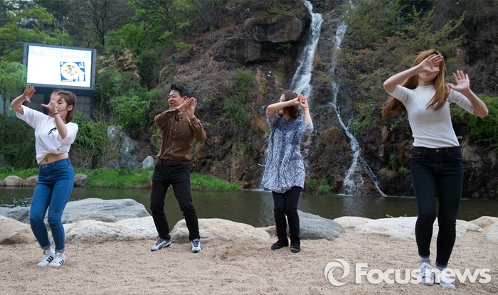 (서울=포커스뉴스) 제20대 국회의원 선거에서 당선된 김영호 더불어민주당 서대문을 당선자가 18일 오후 서울 서대문구 홍제천 폭포마당에서 입수 전 부인 정현경 씨와 픽미댄스를 추고 있다. 김 당선자는 서대문을 지역 투표율 60% 달성 시 홍제천 입수, 아내는 픽미댄스를 추겠다고 약속 하였다.