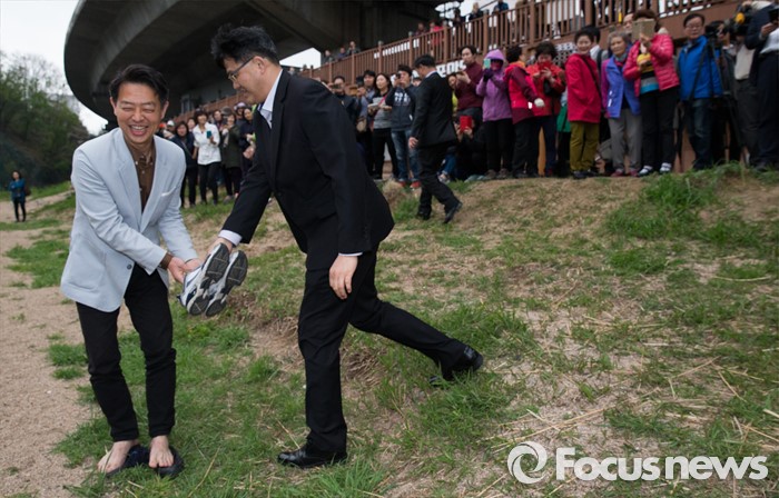 (서울=포커스뉴스) 제20대 국회의원 선거에서 당선된 김영호 더불어민주당 서대문을 당선자가 18일 오후 서울 서대문구 홍제천 폭포마당에서 입수 전 신발을 갈아 신고 있다. 김 당선자는 서대문을 지역 투표율 60% 달성 시 홍제천 입수, 아내는 픽미댄스를 추겠다고 약속 하였다.