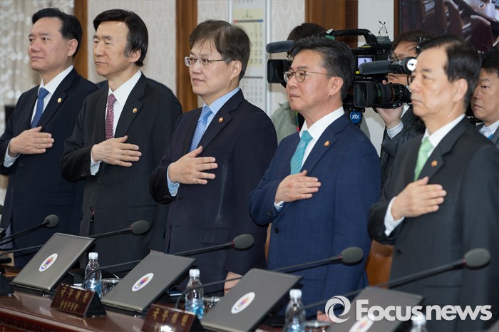 (서울=포커스뉴스) 19일 오전 서울 종로구 정부서울청사에서 열린 국무회의에서 한민구(오른쪽부터) 국방부 장관, 홍용표 통일부 장관, 최양희 미래창조과학부 장관, 윤병세 외교부 장관을 비롯한 국무위원들이 국기에 대한 경례를 하고 있다.