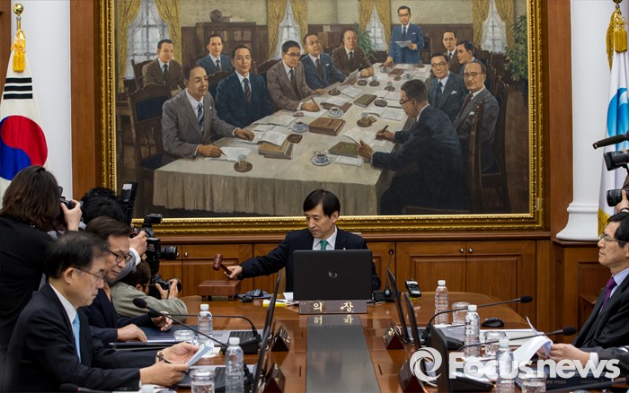 (서울=포커스뉴스) 이주열 한국은행 총재가 19일 오전 서울 중구 남대문로 한국은행 본관에서 열린 금융통화위원회의에 참석해 개회를 알리는 의사봉을 두드리고 있다.